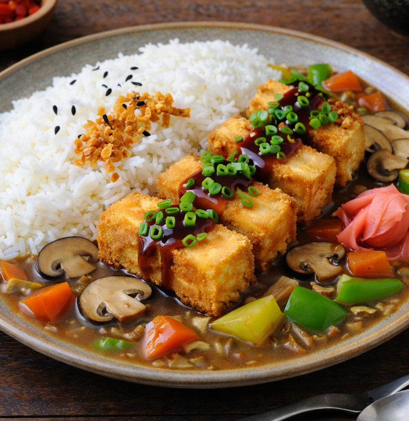 So the challenge here was to recreate that feeling — without the chicken. The answer was fried firm tofu. It holds its shape, takes on flavour beautifully, and gives the curry that satisfying bite you need. Loaded up with mushrooms, potatoes, carrots, sweet potato and green peas, this is the kind of dish that fills you up and warms you from the inside out. Served with steamed rice and a side of pickled ginger (from a jar because who has time to fucking pickle ginger in a hurry) , just like Mum used to do it.