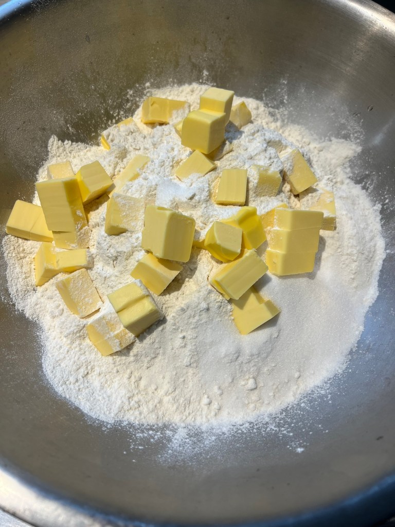Step 2 — In a large bowl rub together the flour, sugar and butter with your fingertips until the mixture resembles a coarse meal. Take your time here — you want the butter evenly distributed throughout the flour before you add any liquid.