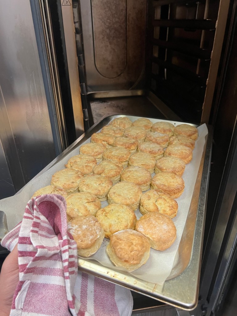 Step 5 — Place on a lined baking tray, dust lightly with flour, and bake for 25 minutes or until puffed up and lightly golden on top. Serve warm with jam and cream. Speaking of jam — stay tuned for the berry jam recipe coming soon.