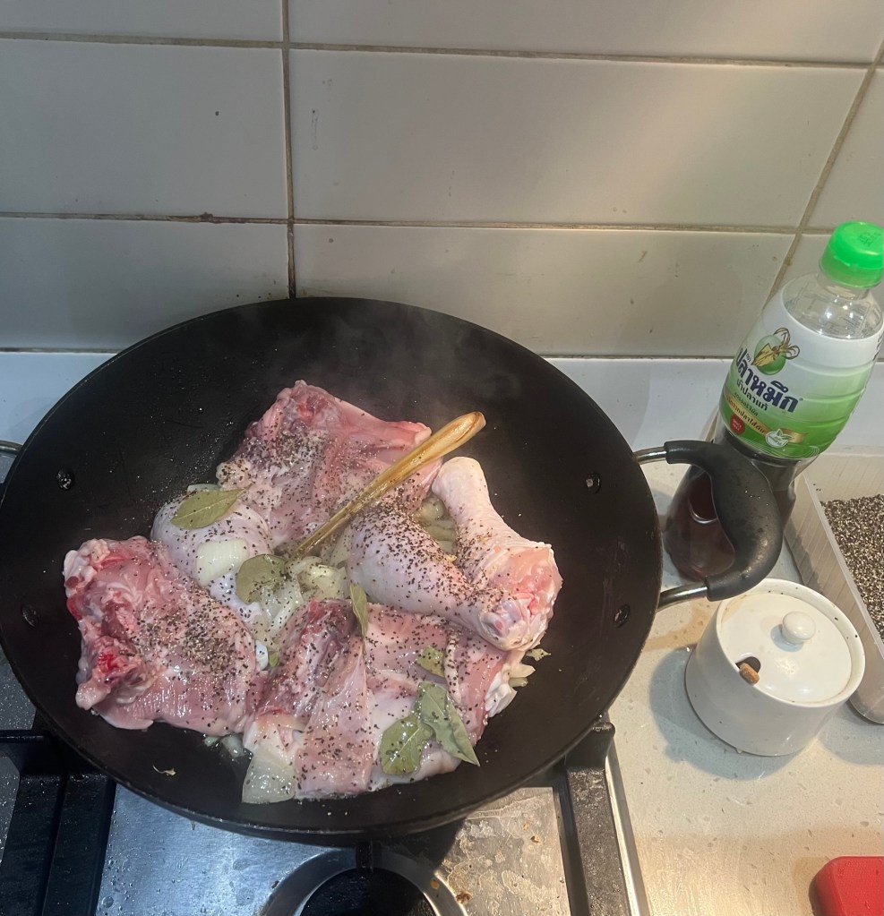 Step 4 — Season with patis, salt, and cracked black pepper. Add the laurel leaves. Pour in enough water to just cover the chicken — around 1.5 to 2 litres. Bring to a boil then reduce to a steady simmer.
